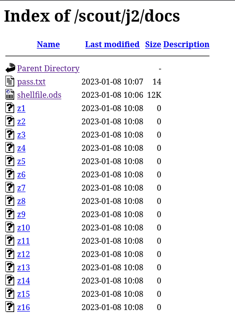 The complete path is /scout/j2/docs. Visiting this URL reveals many empty files named z1 to z999. I wrote a Python script to find the non-empty file.