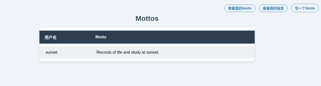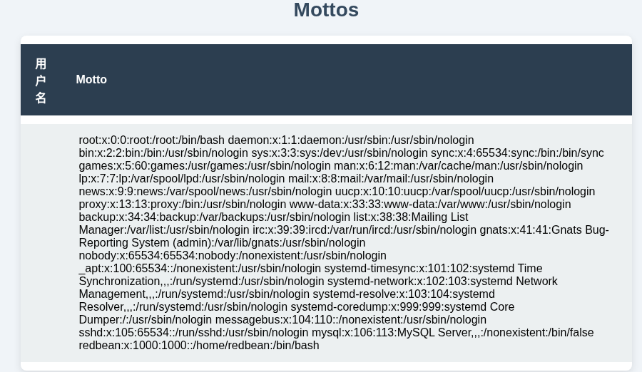 | 用户名 | Motto | |---|---| | admin is no use | admin is no use | | RedBean | cannotforgetyou | | user1 | user11 |