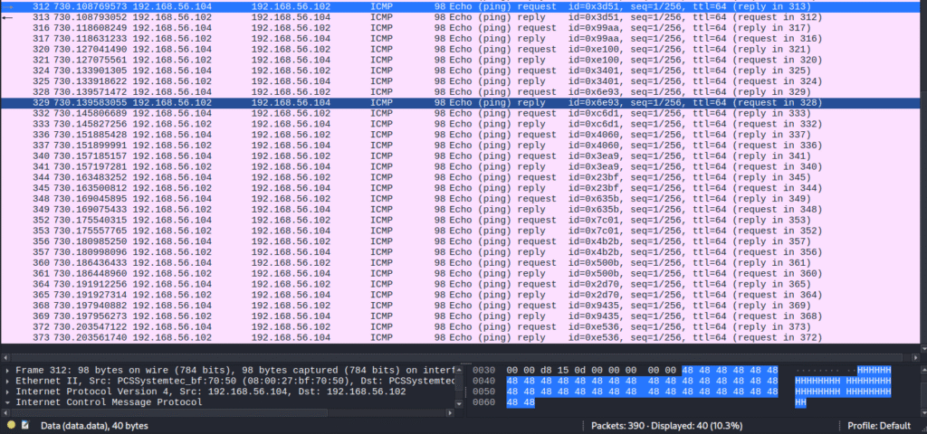 The output indicates that the file /root/root.txt is being transmitted in 21 separate ICMP echo request packets to our machine (192.168.56.102). Just like with the user flag, we captured these packets using Wireshark