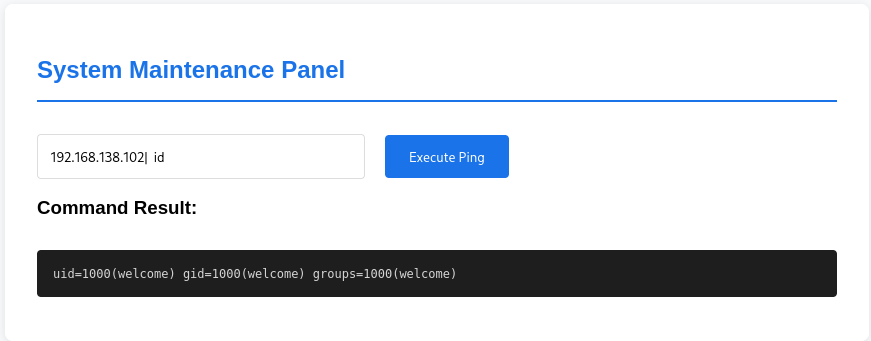 uid=1000(welcome) gid=1000(welcome) groups=1000(welcome)