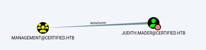 In bloodhound, we discovered that judith.mader had WriteOwner privileges over the Management group. This allowed us to take ownership of the group and grant ourselves additional rights.